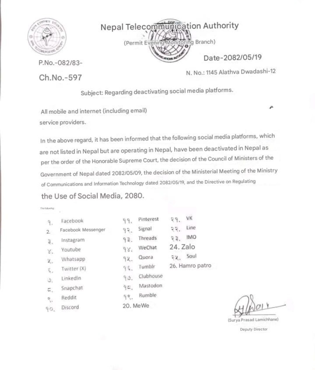 नेपाल सरकारले जारी गरेको सामाजिक सञ्जालको प्रयोग व्यवस्थित गर्न बनेको निर्देशिका–२०८० बमोजिम सञ्चार तथा सूचना प्रविधि मन्त्रालयमा आफ्नो प्लेटफर्मको सूचीकरणका लागि सोही निर्देशिकाका अनुसूची १ बमोजिमको ढाचाँमा तोकिएको कागजातहरु संलग्न गरी ७ दिनभित्र निवेदन दिन भनेको थियो।